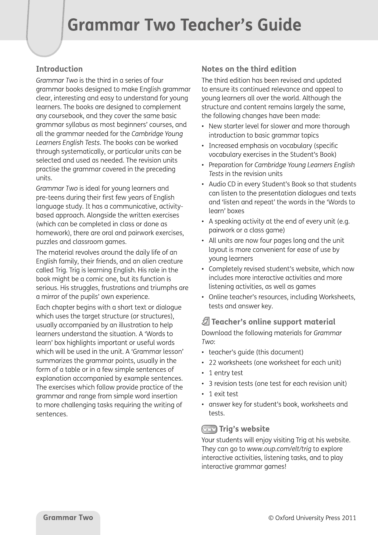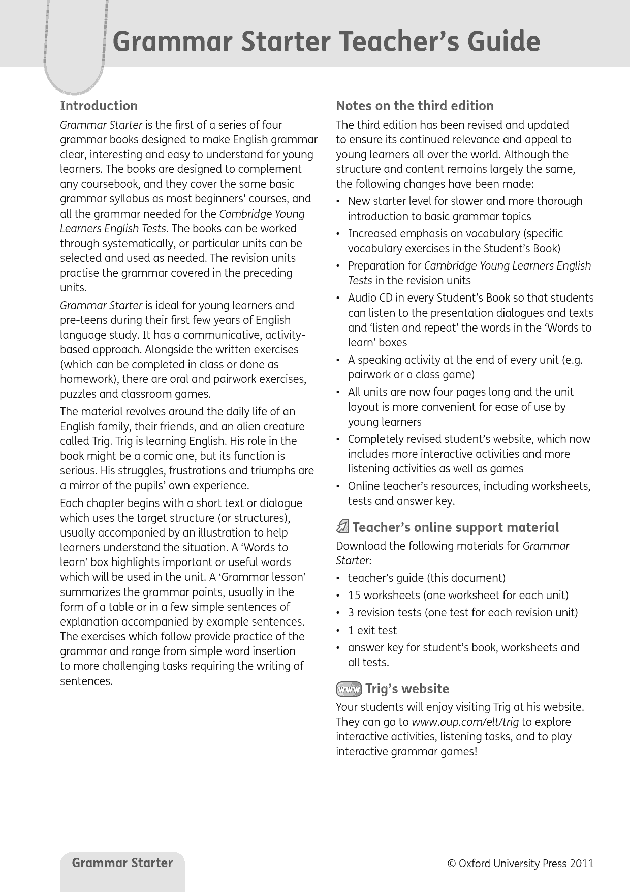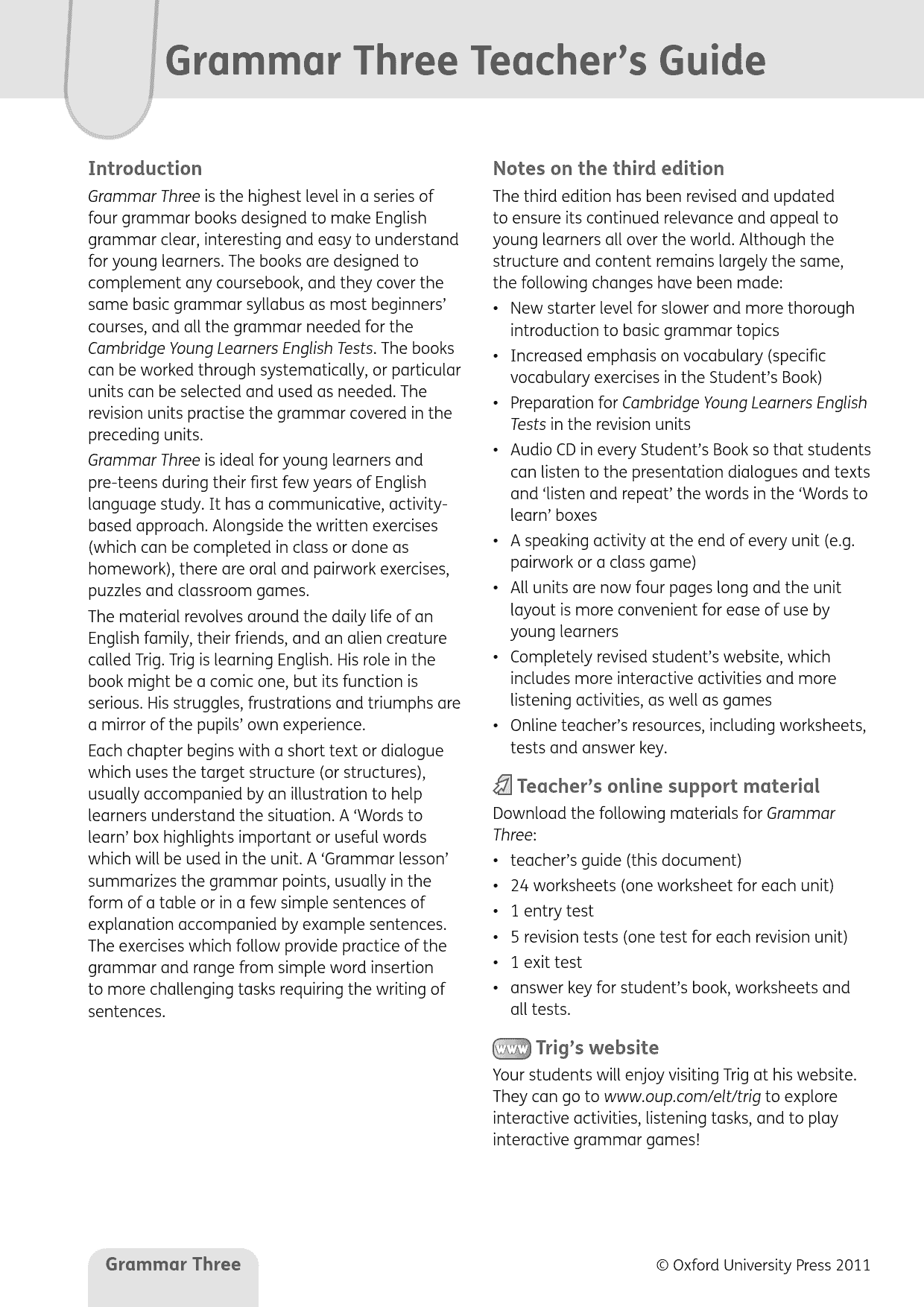 A communicative, activity-based course, Grammar, Third Edition is now richer in resources with a new Starter level, student’s audio CD, and more online support for both teachers and students. Extra vocabulary and exam-based activities help prepare for Cambridge ESOL Young Learners English Tests.